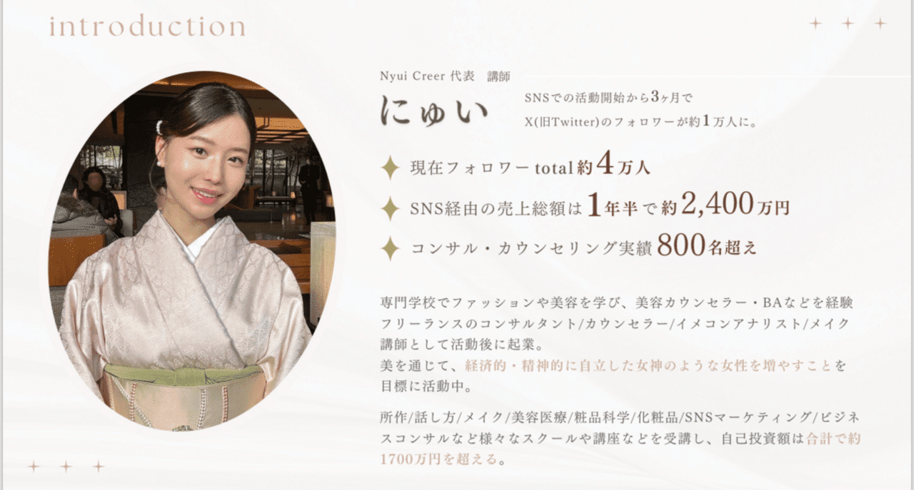 SNSでの活動開始から 3ヶ月でX(旧Twitter)のフォロワーが約1万人に現在フォロワー total 約4万人。SNS経由の売上は1年半で約2,400万円コンサル・カウンセリング実績は800名越え