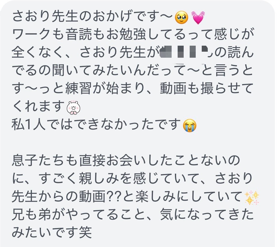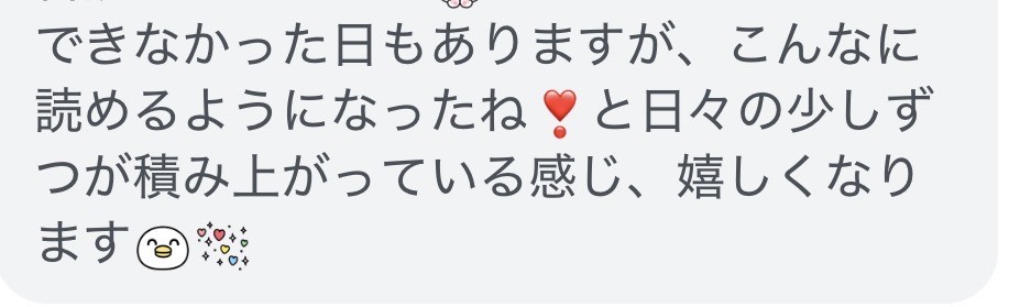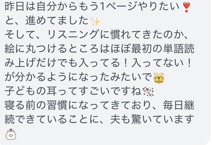 → 受講3日で「Pigeon 読んでみる!」と自分から音読→ 家の中で文字を探し始める→ ママ「読める喜びを一緒に味わえています」