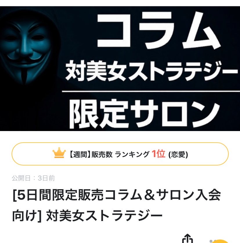 前回のサロン募集およびコラムに関しては、週間ランキングで1位を頂いた。(販売期間も5日間限定)
