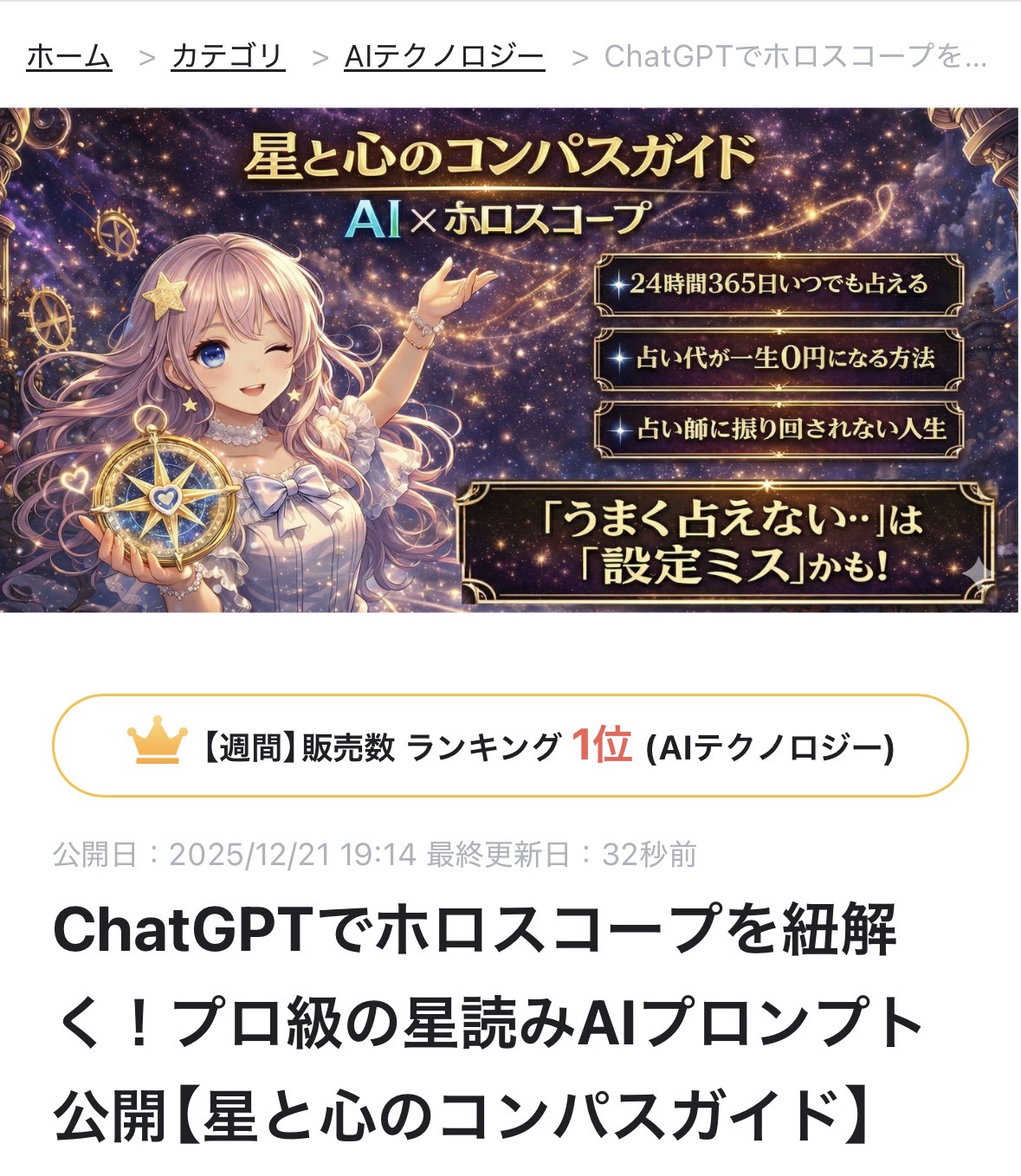 【2025年12月25日:ホロスコープ天体記号マニュアル追加(ステップ4に追加)】【2025年12月29日:ChatGPTの設定について補足説明追加(よくある質問に追加)】【2025年12月30日:レビュー特典追加(特典:レビュー投稿に追加)】【2026年1月1日:お年玉特典追加(個性・才能・能力プロンプト)】【2026年2月14日:バレンタイン特典追加(恋愛運・結婚運、既婚者向けパートナーシップ各プロンプト)】