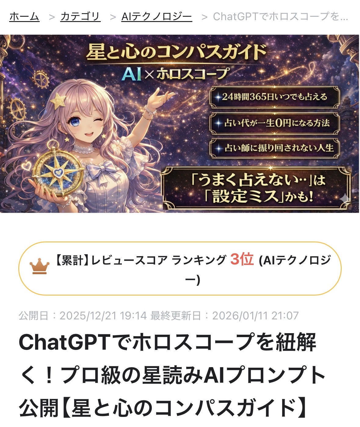 「コスパ良すぎです!!購入させて頂いて、内容をそのまま入力するだけでホロスコープが読めてしまい感動しました!!これを機にAIにハマりまくりました🤣今では自分用にカスタマイズしまくって使っています😚💕」