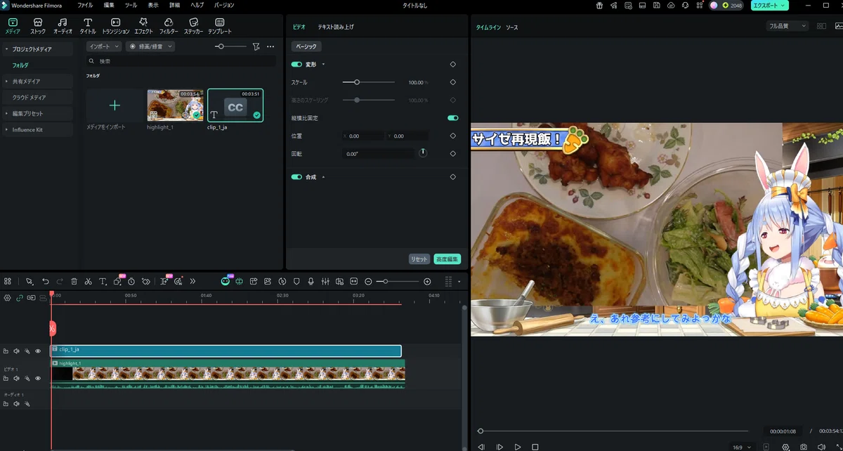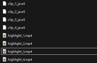 例えば、clip_1_ja.srtの字幕は、highlight_1.mp4と連動しているので動画編集ソフトで同じタイムライン上に置きます。