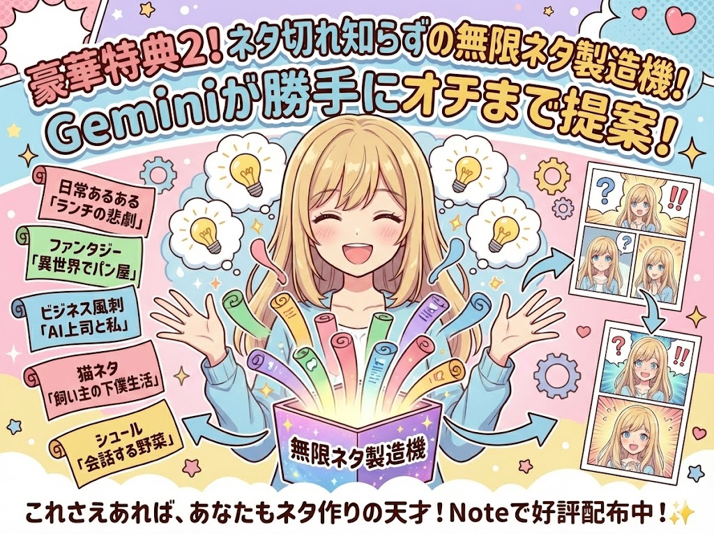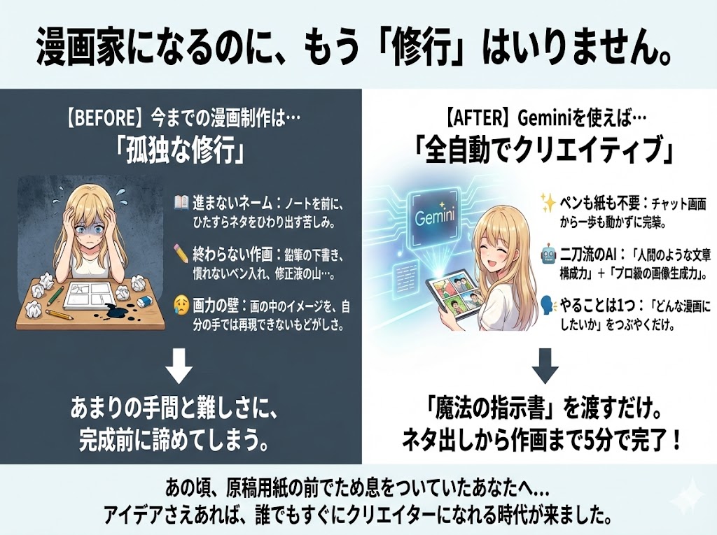 **GoogleのAI「Gemini」**を使えば、あの時の苦労はもう必要ありません。 Geminiは今、「人間のような文章構成力」と「プロ級の画像生成力(Imagen 3)」の両方を持っています。つまり、チャット画面から一歩も動かずに、ネタ出しから作画まで、全部ひとりでやってくれるのです。