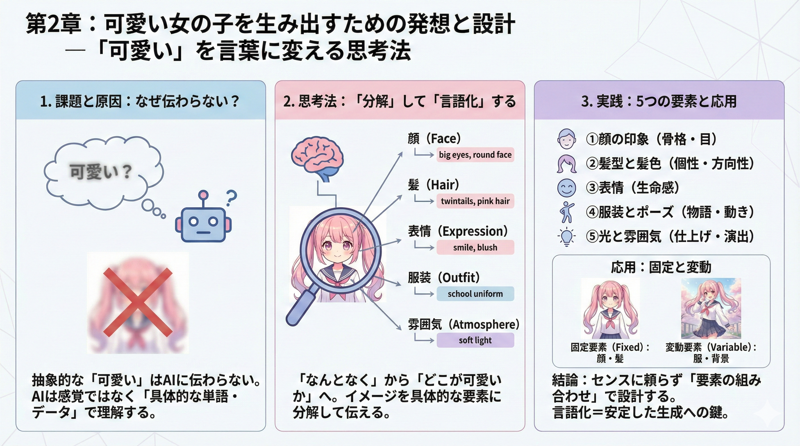 「可愛い」という抽象的な感覚を、具体的な要素へ落とし込む方法を解説する。顔立ち、髪型、目の色、表情、服装、ポーズ、光、背景といった構成要素に分解し、それぞれが印象に与える影響を説明する。また、「固定要素」と「変動要素」の考え方を導入し、同一キャラクターを複数枚展開する方法にも触れる。ここは“発想”から“設計”へ変換する重要章。