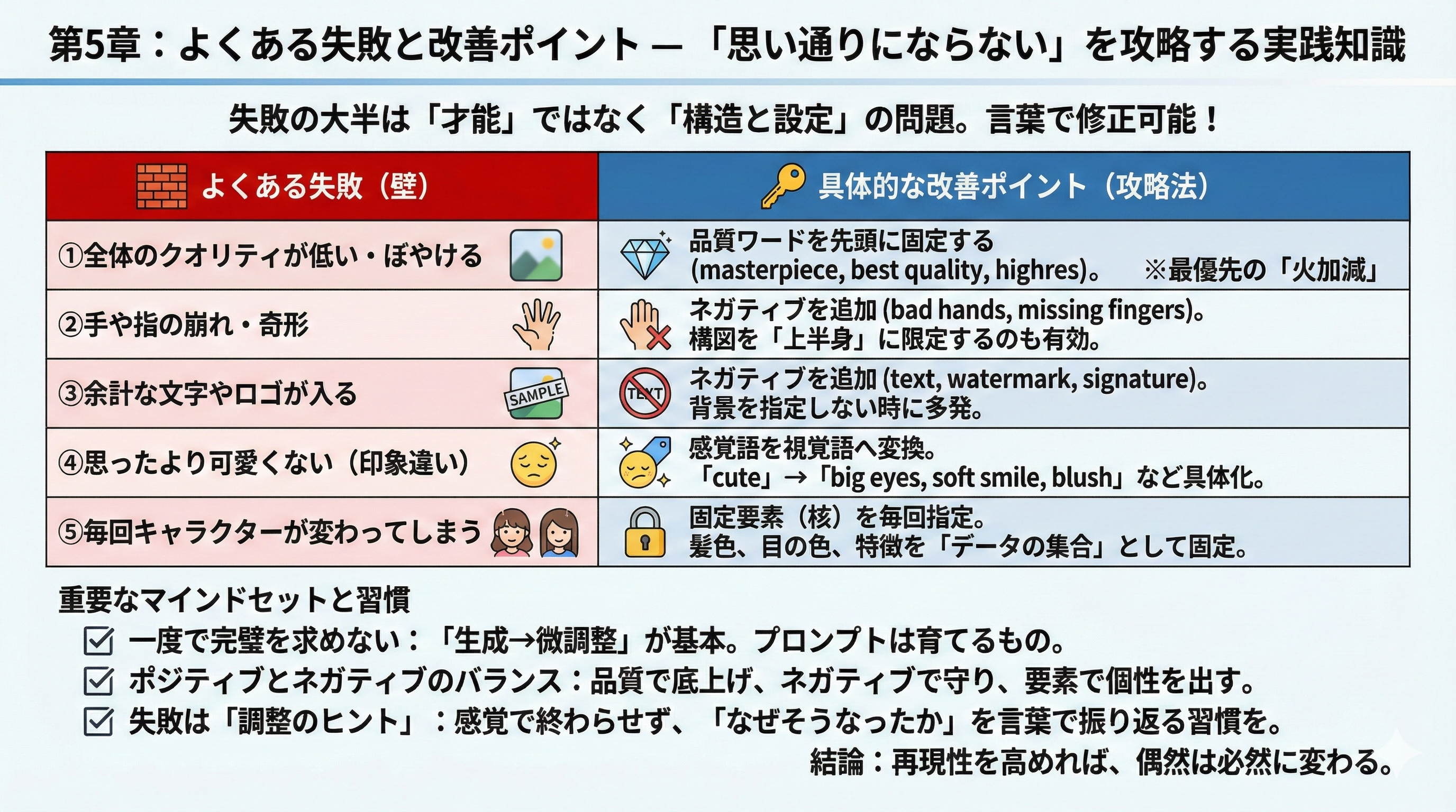 顔が崩れる、手がおかしい、画質が低い、余計な文字が入る、思ったより可愛くならない――こうした典型的な失敗を原因別に整理する。品質ワード不足、ネガティブ不足、要素の曖昧さ、固定要素の欠如など、具体的な対処法を提示する。ここでは「失敗=ヒント」であるという認識転換を行う。