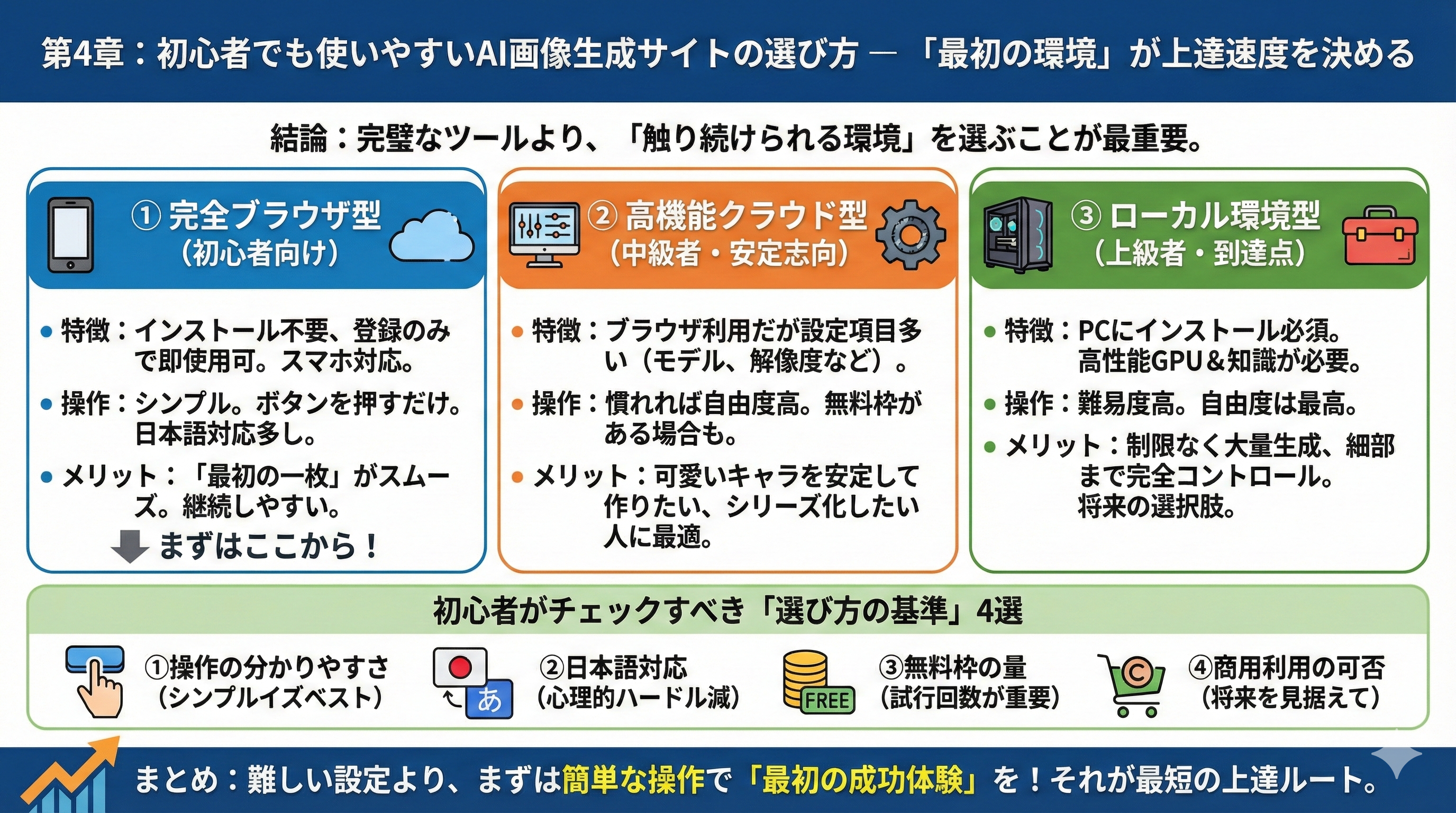 ツール選びで迷わないための指針を示す章。「簡単さ」「日本語対応」「無料枠」「商用利用可否」「操作画面の分かりやすさ」を基準に解説する。ブラウザ型、高機能クラウド型、ローカル型の違いを紹介し、最初は軽い環境から始める重要性を伝える。ここでは“最初の成功体験”が継続率を高めることを強調する。