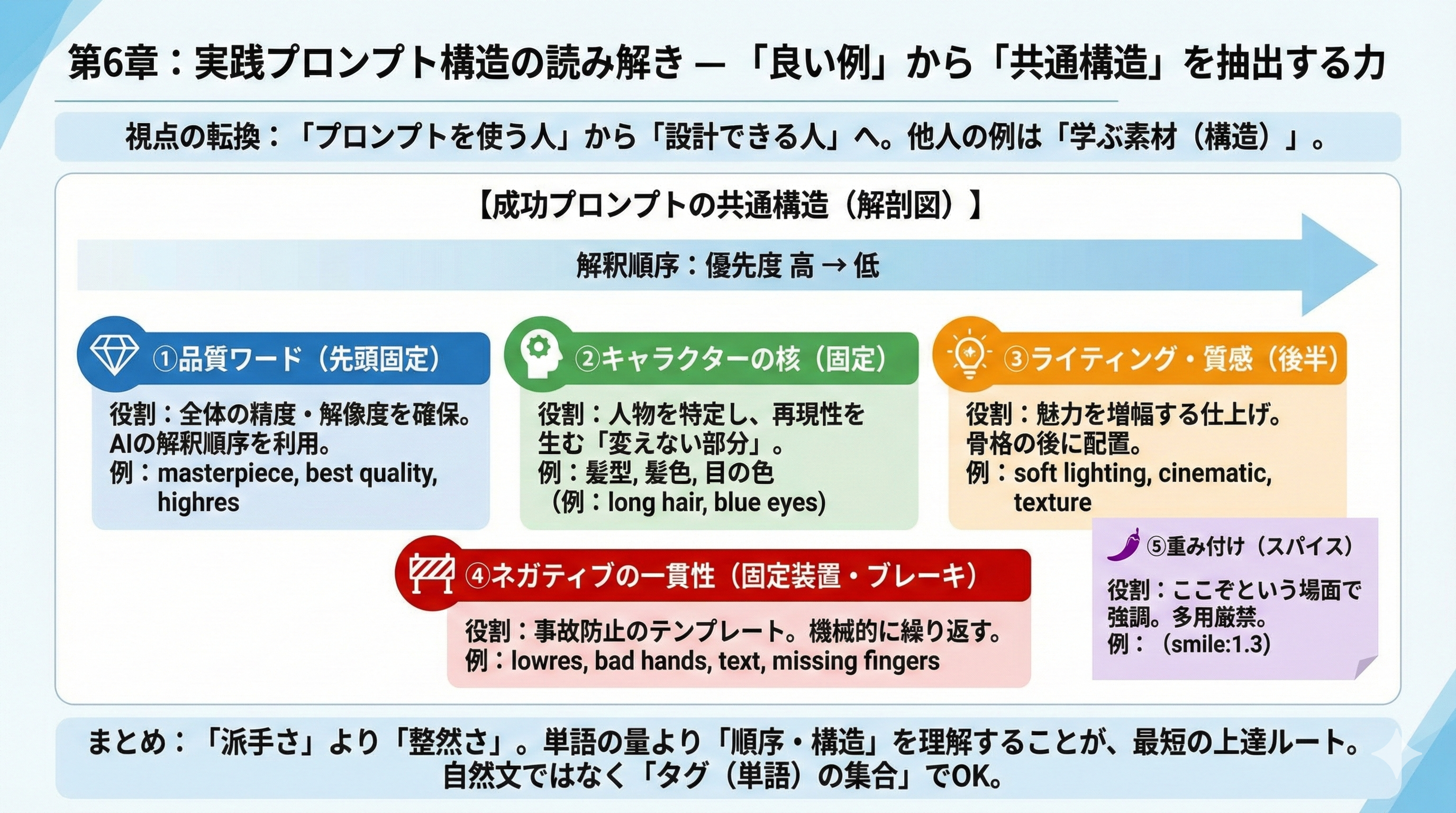 本書の中核。プロンプトは文章ではなく設計図であることを明示し、以下の構造を基本型として提示する。品質ワード → キャラクター要素 → 表情・雰囲気 → 背景・構図 → 補足 → ネガティブ除外