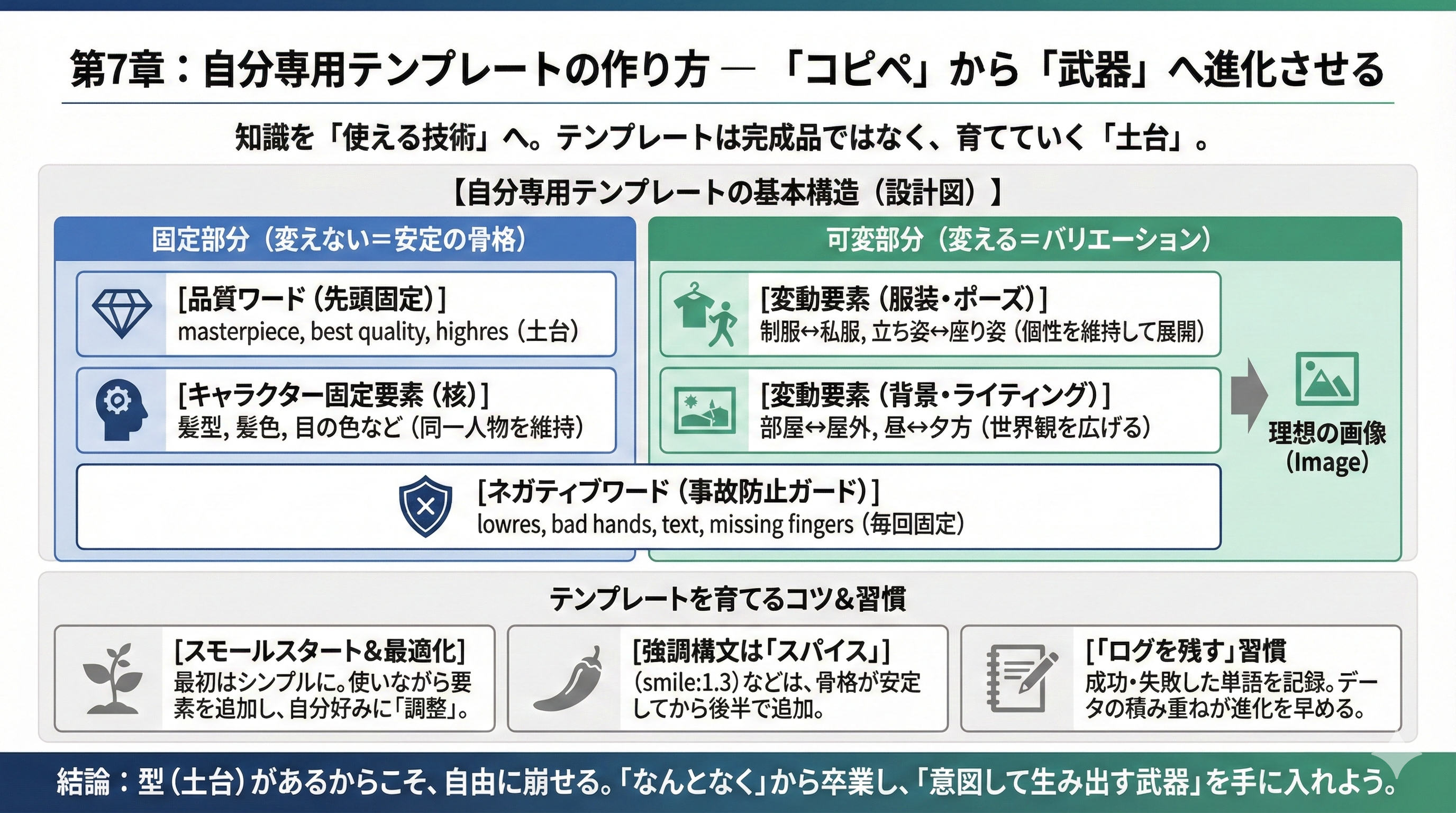 ここまで読み進めてきたあなたは、すでにAI画像生成の基本構造、可愛い女の子の設計方法、品質ワードとネガティブワードの重要性、そして良いプロンプトの共通点を理解しています。しかし、知識として理解しているだけでは、まだ“使える状態”とは言えません。本当に結果を安定させるために必要なのは、「自分専用のテンプレートを持つこと」です。テンプレートとは単なるコピペ用の文章ではなく、何度でも同じ品質を再現できる“武器”です。この章では、その武器をどう作り、どう育てていくかを解説します。