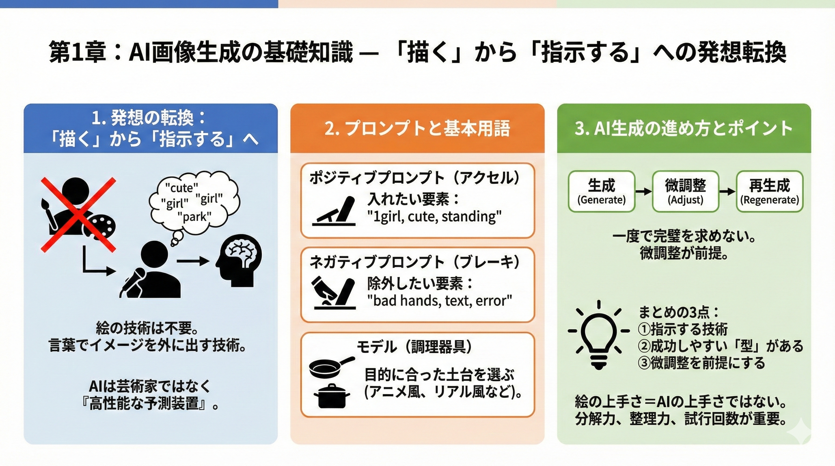 この章で押さえておくべきポイントは三つあります。一つ目は、AI画像生成は“描く技術”ではなく“指示する技術”であること。二つ目は、プロンプトには正解はないが、成功しやすい型は存在すること。三つ目は、一度で完璧を求めず、微調整を前提にすることです。