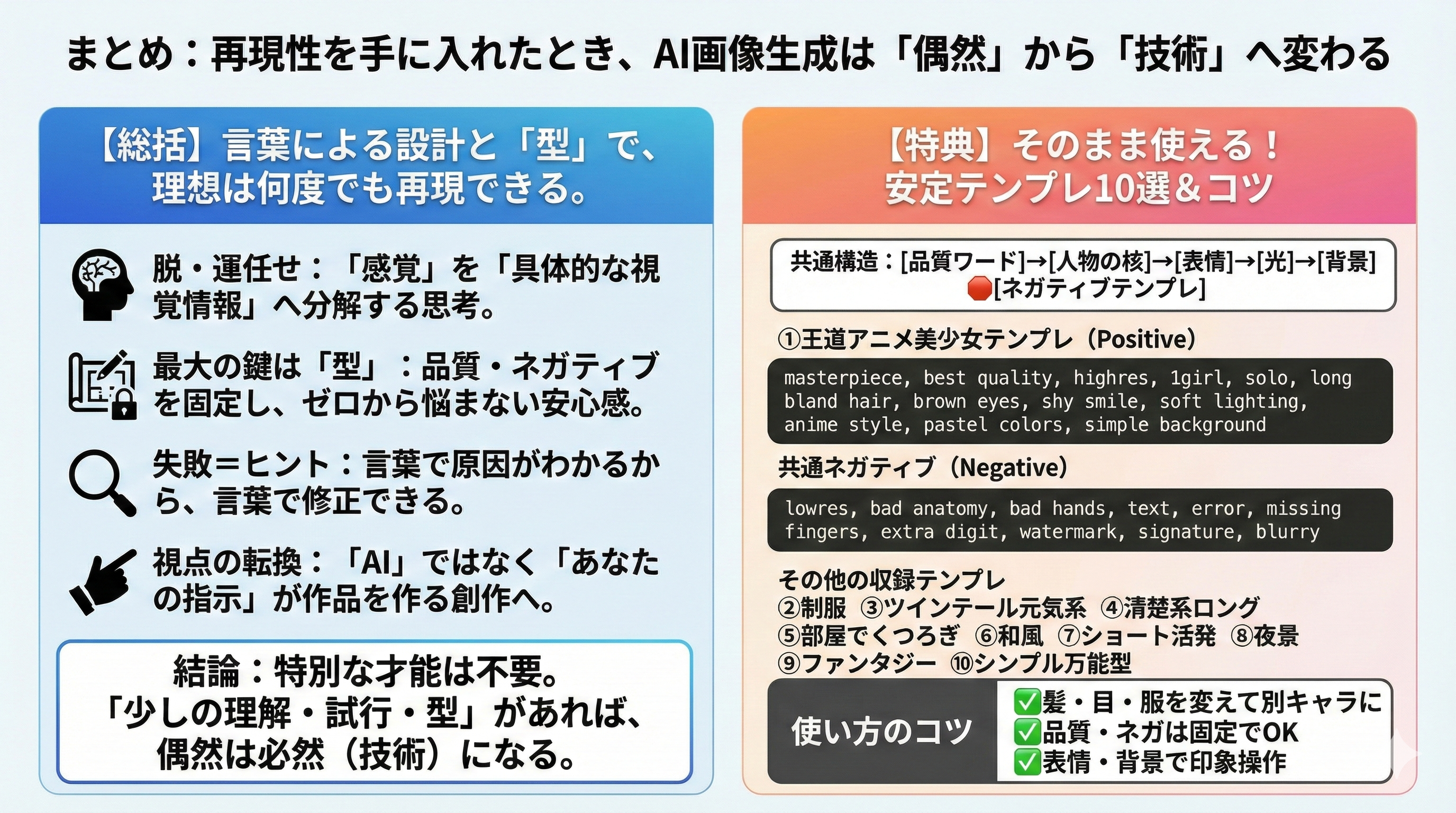 まとめ:再現性を手に入れたとき、AI画像生成は「偶然」から「技術」へ変わる