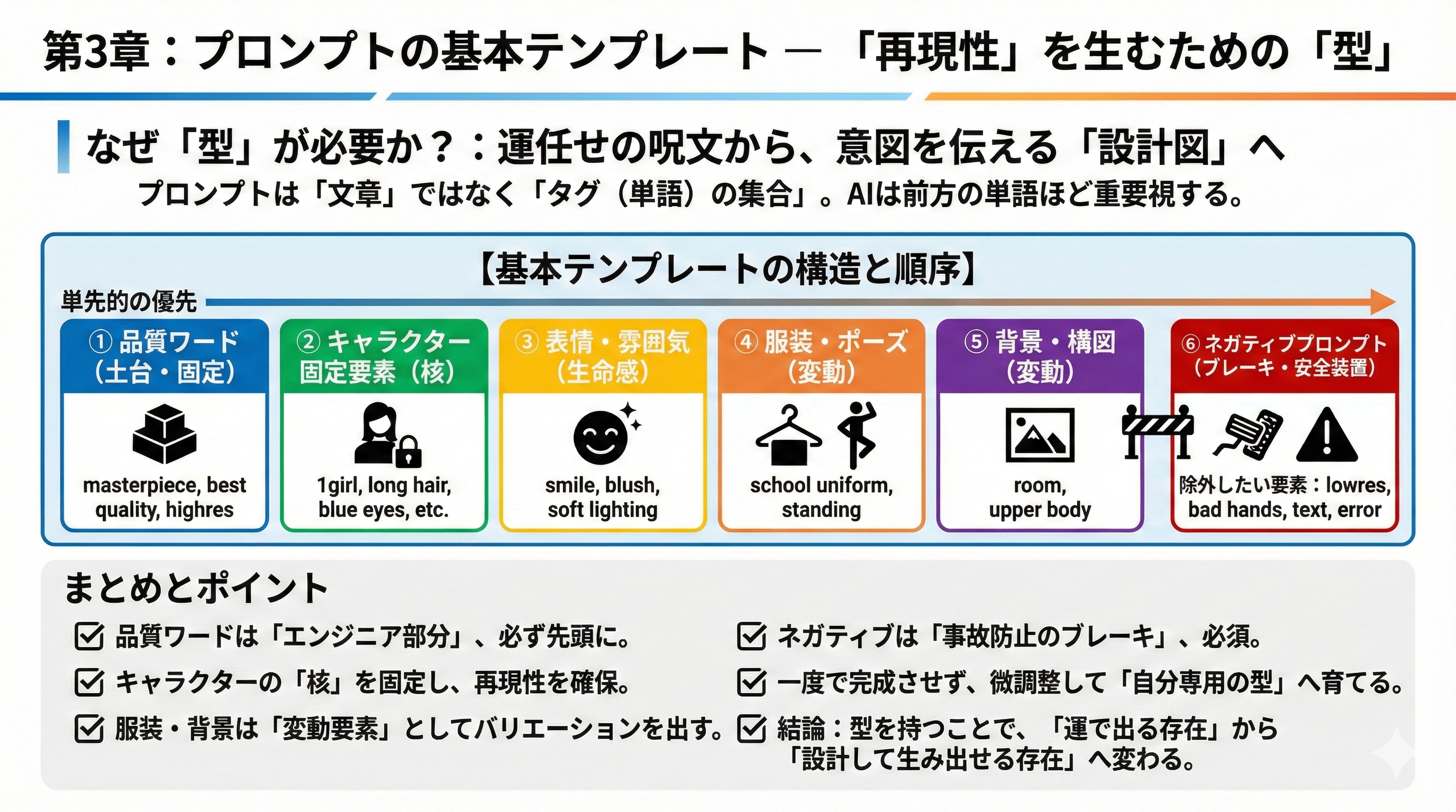 品質ワード → キャラクター固定要素 → 表情・雰囲気 → 服装・ポーズ → 背景・構図 → 補足ワード → ネガティブプロンプト