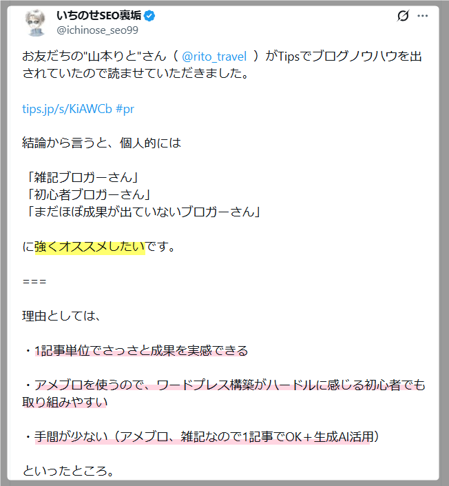 複数の特化ブログで月収500万円を余裕で稼ぎ続ける、IQ152アフィリエイター「いちのせ氏」にも推奨をいただきました…!!感謝です!!