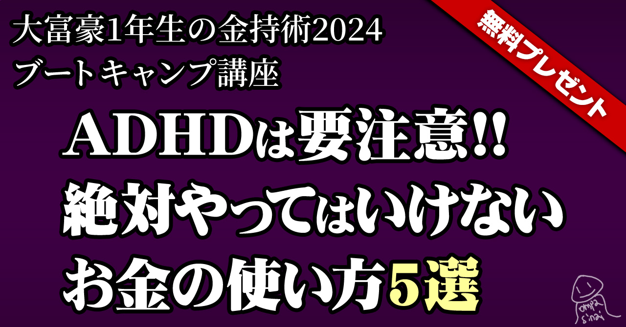 【無料プレゼント】ADHDは要注意!!やってはいけないお金の使い方2024【大富豪1年生の金持術2024ブートキャンプ講座】