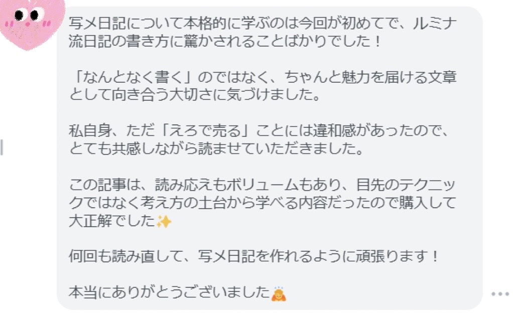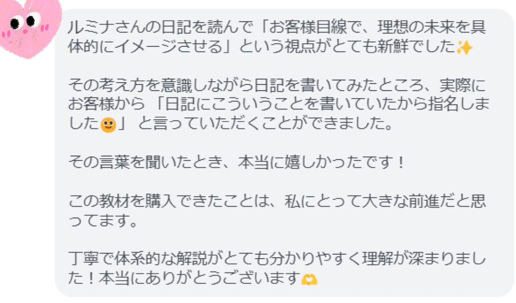 購入していただいた方は、さっそく、ルミナ流日記で結果を出しています。
