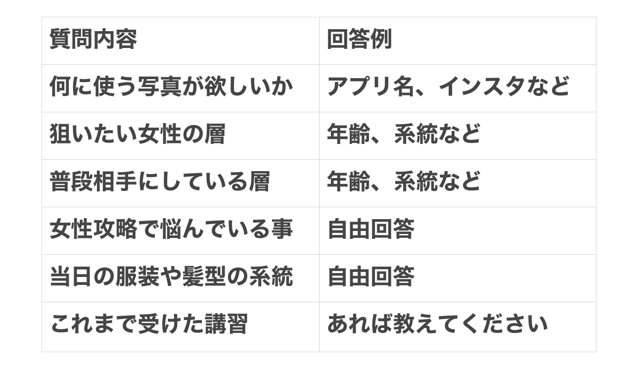 カウンセリングでは、下記の表を元に撮影プランや必要な写真の系統を一緒に決めます。また、撮影場所についても話し合い、あなたに最適なプランを提案します。