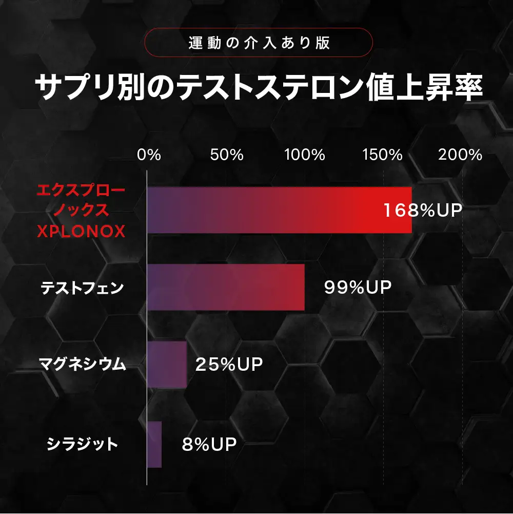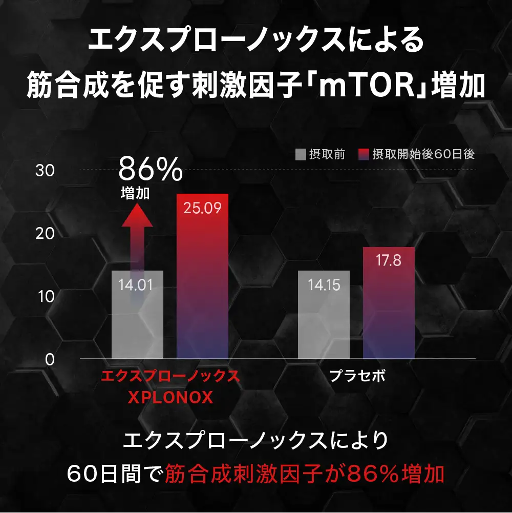 こちらのデータがインパクト抜群で、テストステロンを過去最大レベルに引き上げて、さらに筋肉合成の指令を下すmTORを活性化するとのこと。