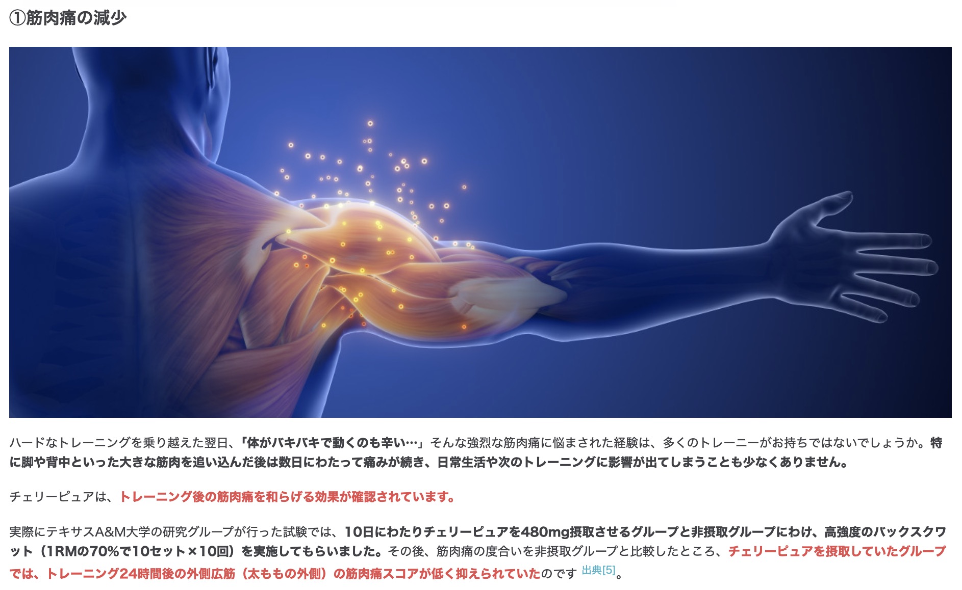 しかもサプマニが注目したのは、テストチャージSTPに含まれるもう一つの成分であるチェリーピュア。強力な抗炎症作用によって筋疲労を和らげて筋肉痛を軽減するという、類似の効果が重ね掛けされているのです。