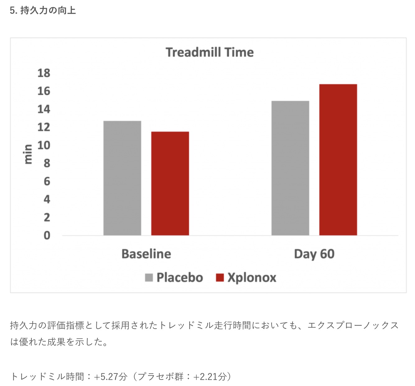 まずエクスプローノックスですが、トレッドミルで疲れるまでの時間を約5分半も遅延させています。単なる運動をしている人は2分半程のようなので、飲むだけで持久力UPの効果が2倍以上だったということですね。先ほど紹介した筋疲労も絡んでいるものと思われますが、いい成果です。