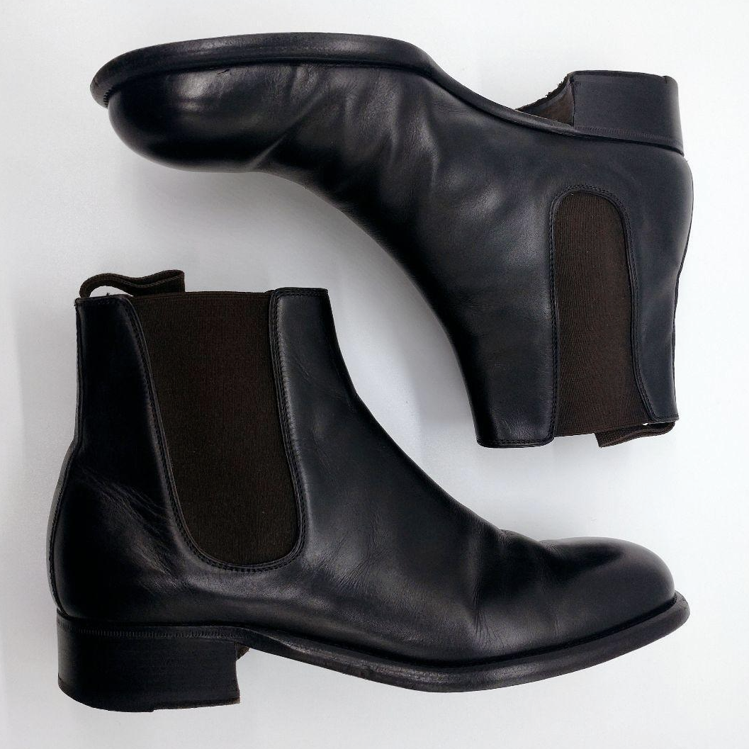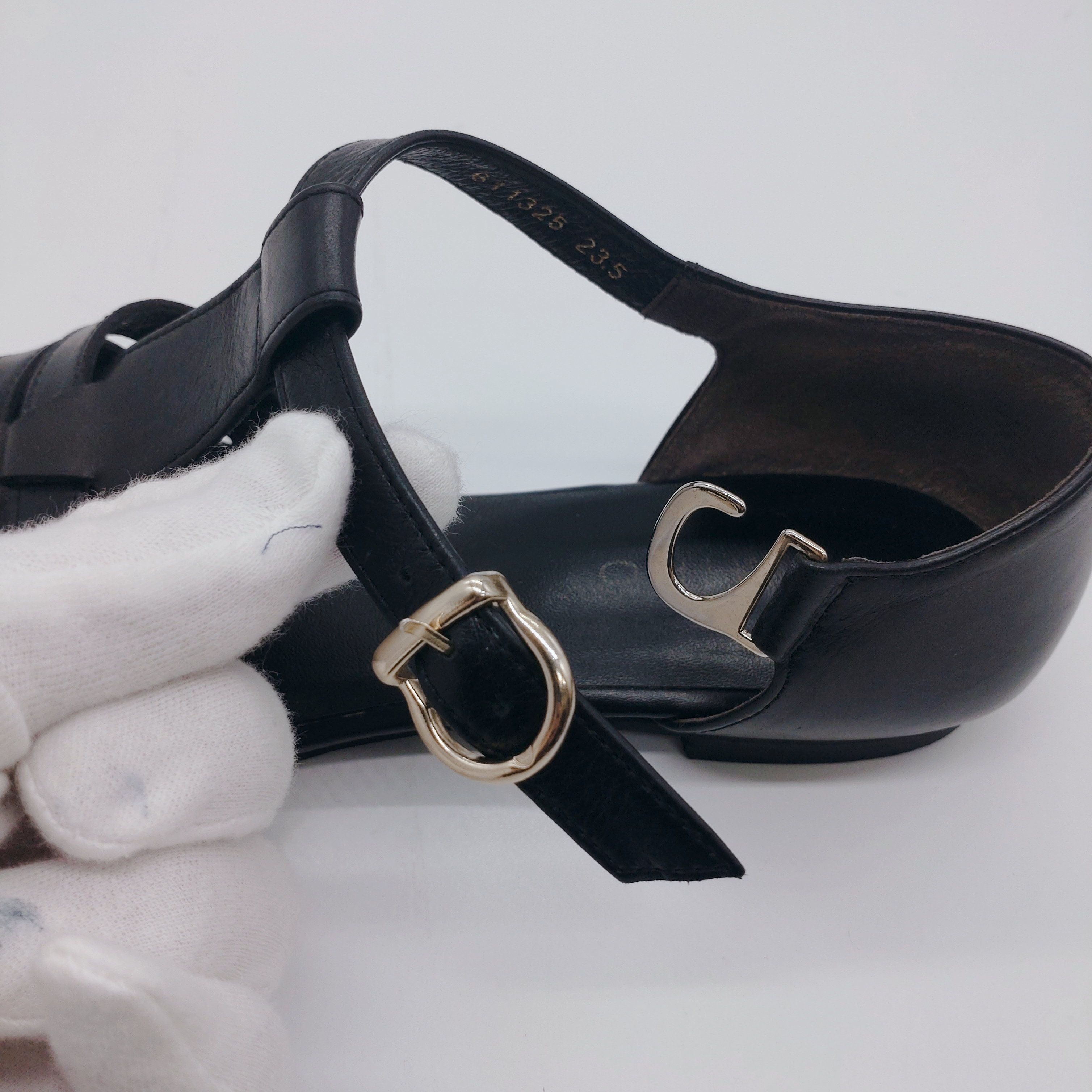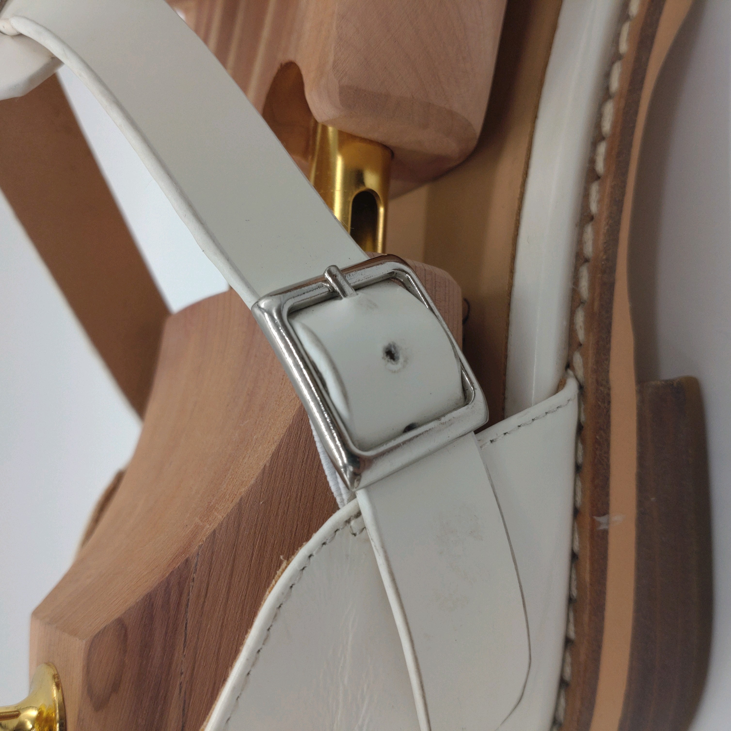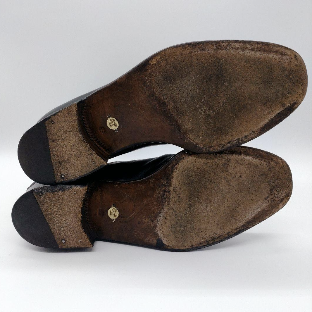 ①写真の一枚目で、一番大事な写真です。爪先を開いて、右足でインソールのロゴや状態、爪先の形を見せます。また、左足でヒールのデザイン、底面のデザインを見せ、一目で靴の大体の特徴を見せます。