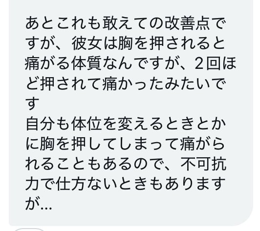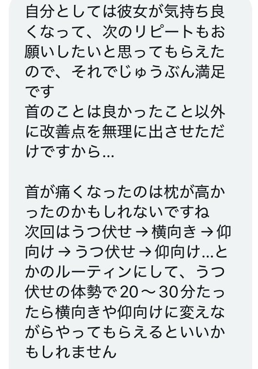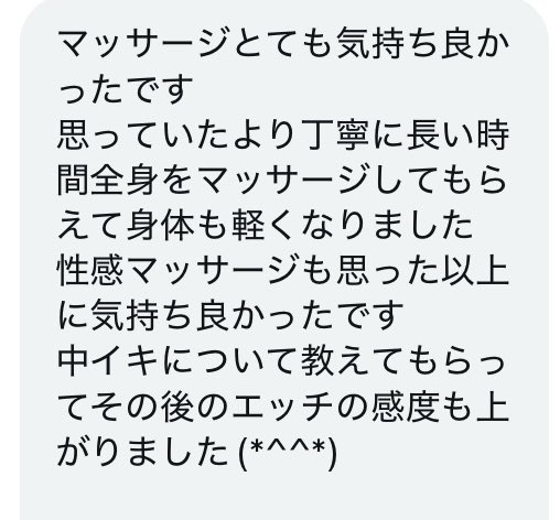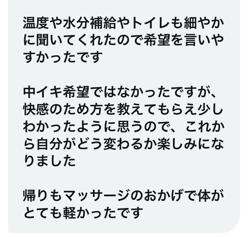 とても丁寧な感想を頂き特に中イキについても理解が深まったとの事で本当に良かったです。NGを完璧に守りこのような感想をもらえた自分を褒めたいと本当に思いました。