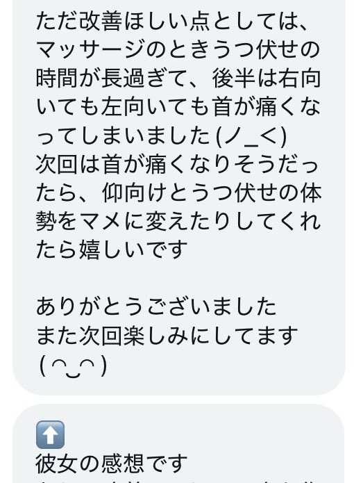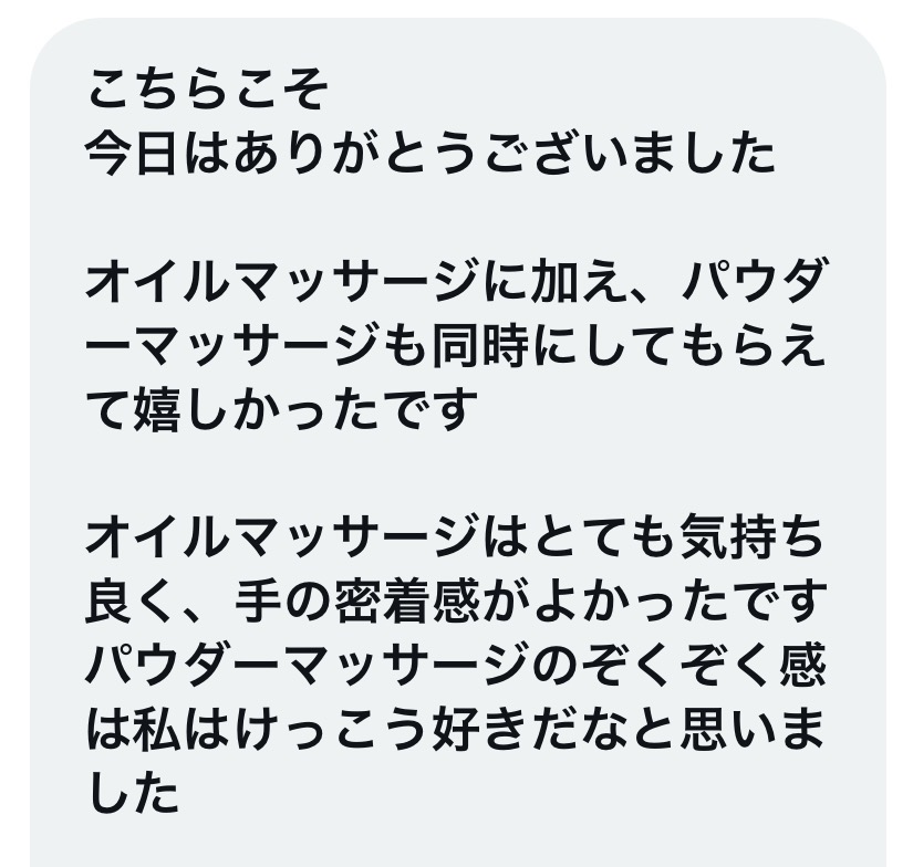 感想もとても面白い内容で返信頂きとても良い時間だったと言って頂けたのが嬉しかったです。なにより女性との関係構築や信頼感が重要であることを理解していただけてオイルマッサージの意味を深く理解して頂けたのが準備して本当によかったと思えました。