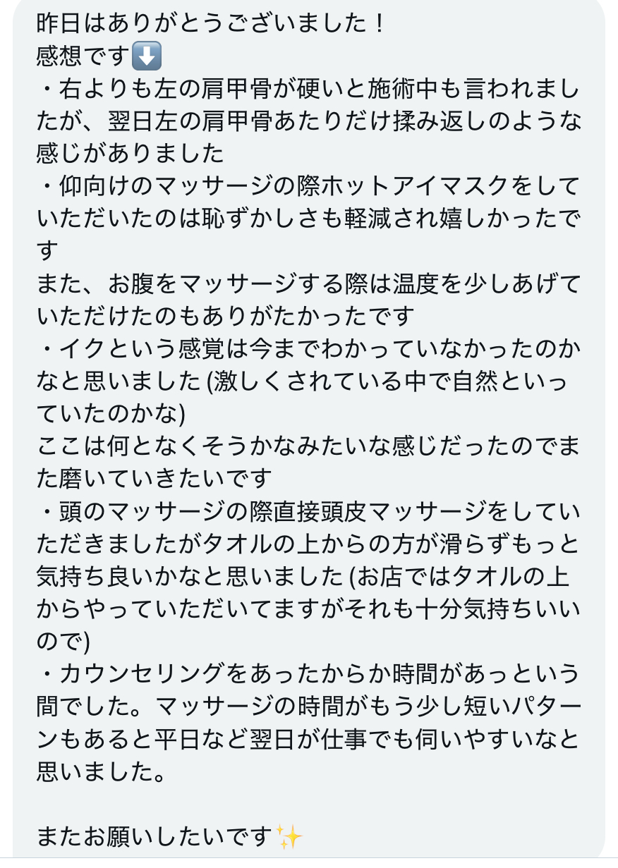 工夫していることや施術の違い、オイルマッサージや性感マッサージでの疑問点など解決していただく機会にして頂き次の施術が楽しみととても丁寧な感想をDMで頂くことが出来てとても嬉しかったです。