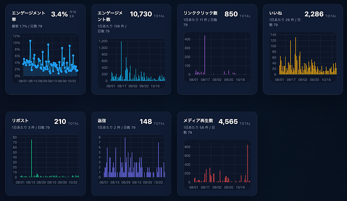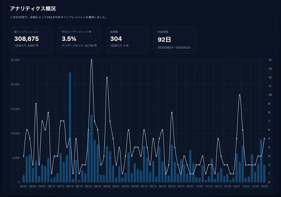 1か月かけて10日でMAX50投稿/日、後半の10日で公式Xでの予約投稿を実施してます。(合計10000投稿)