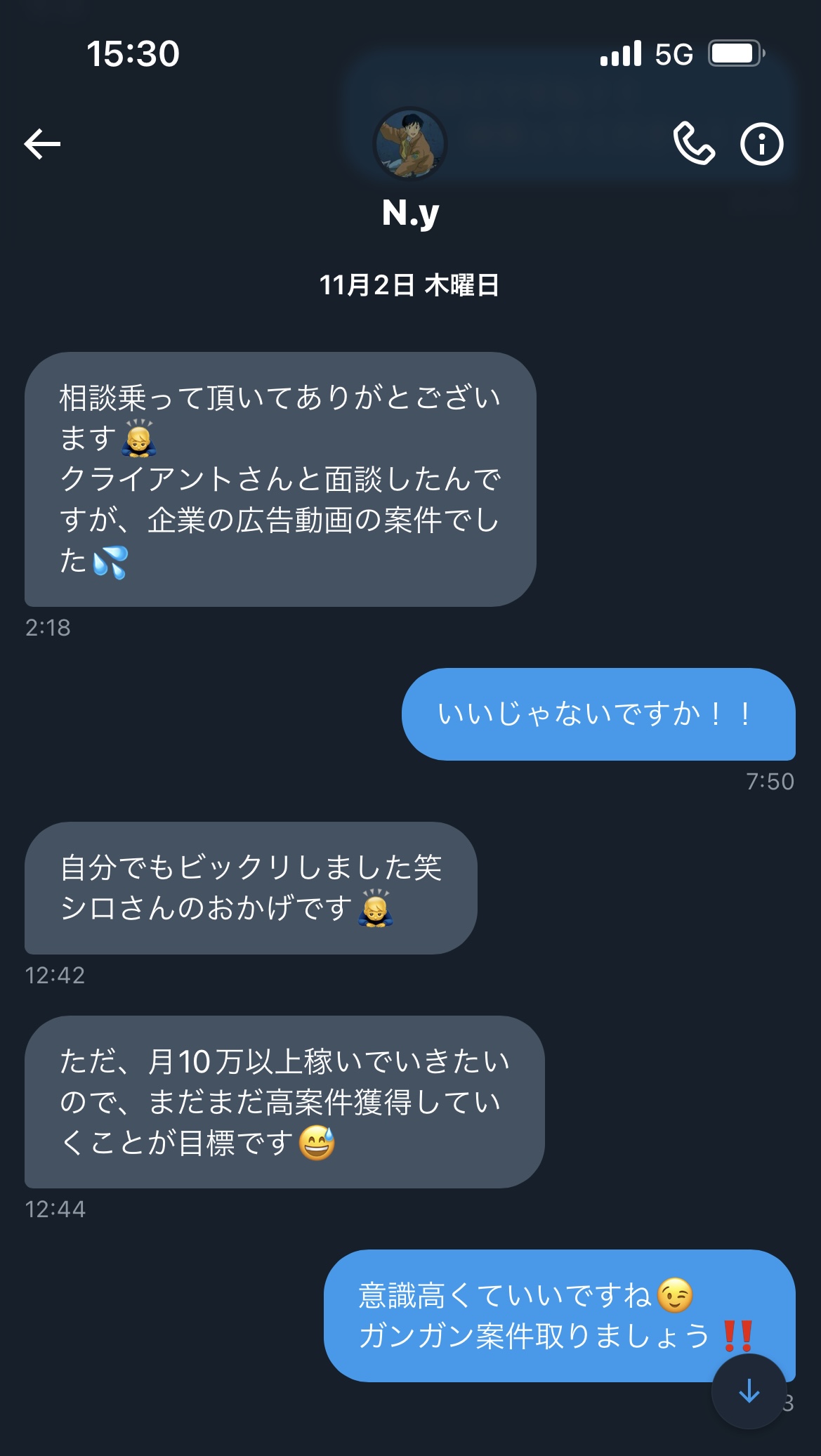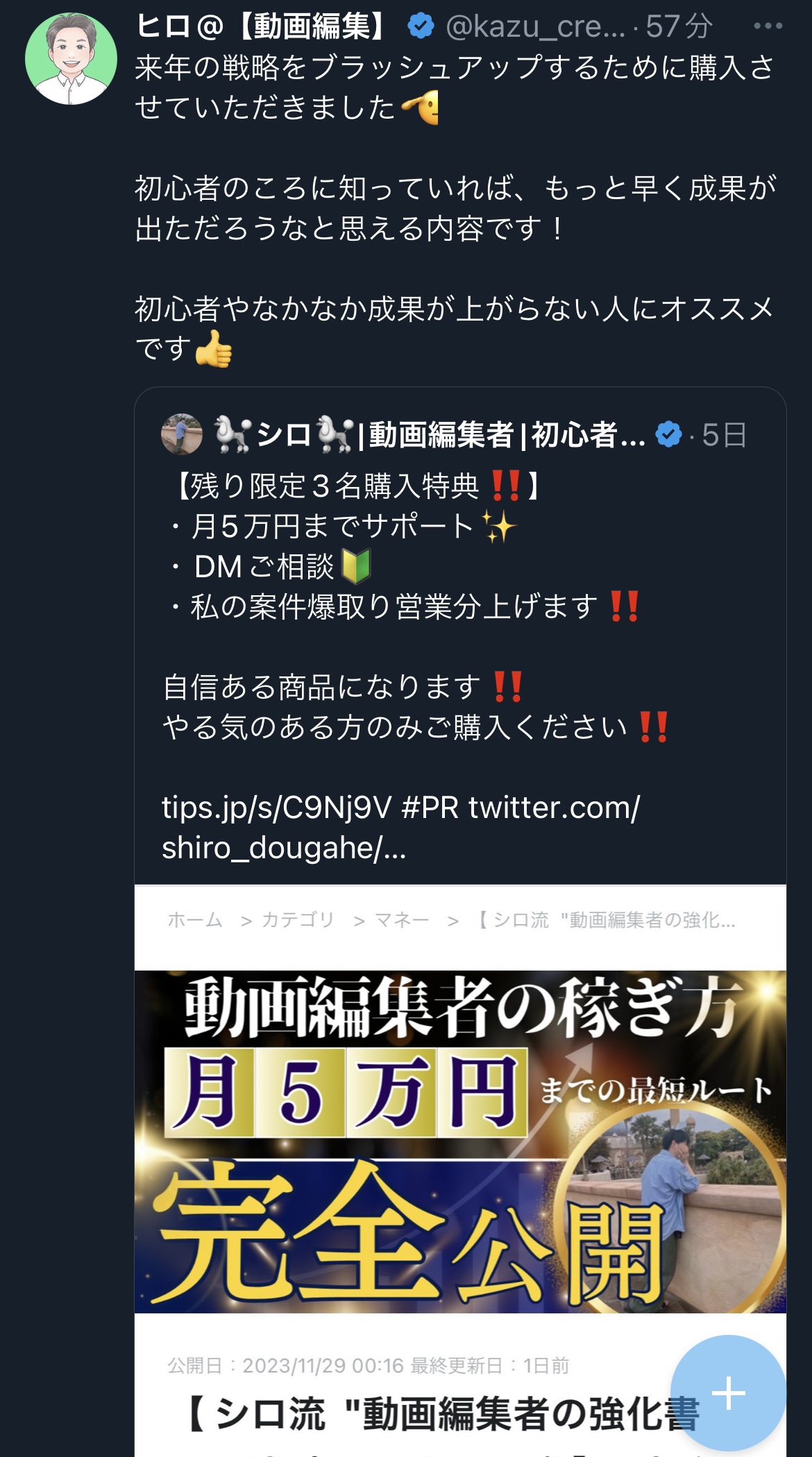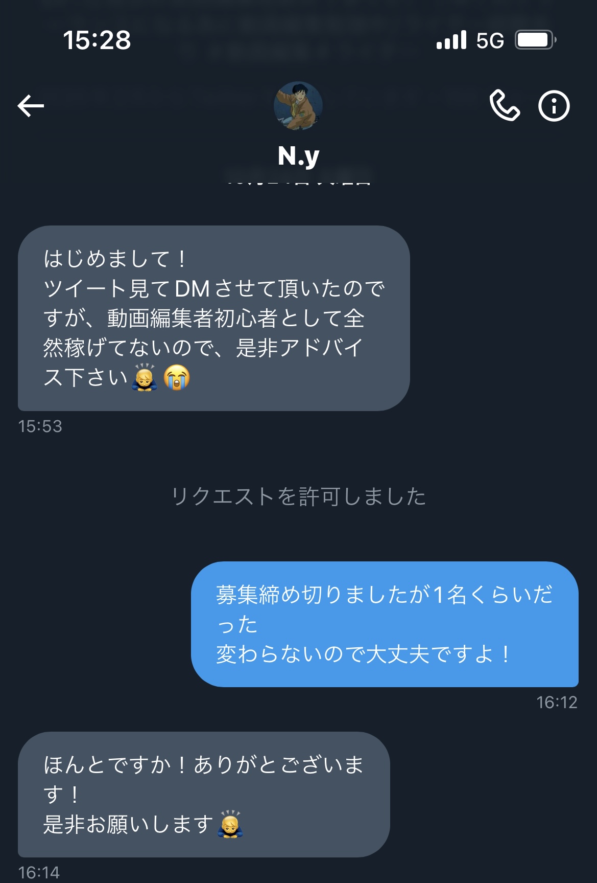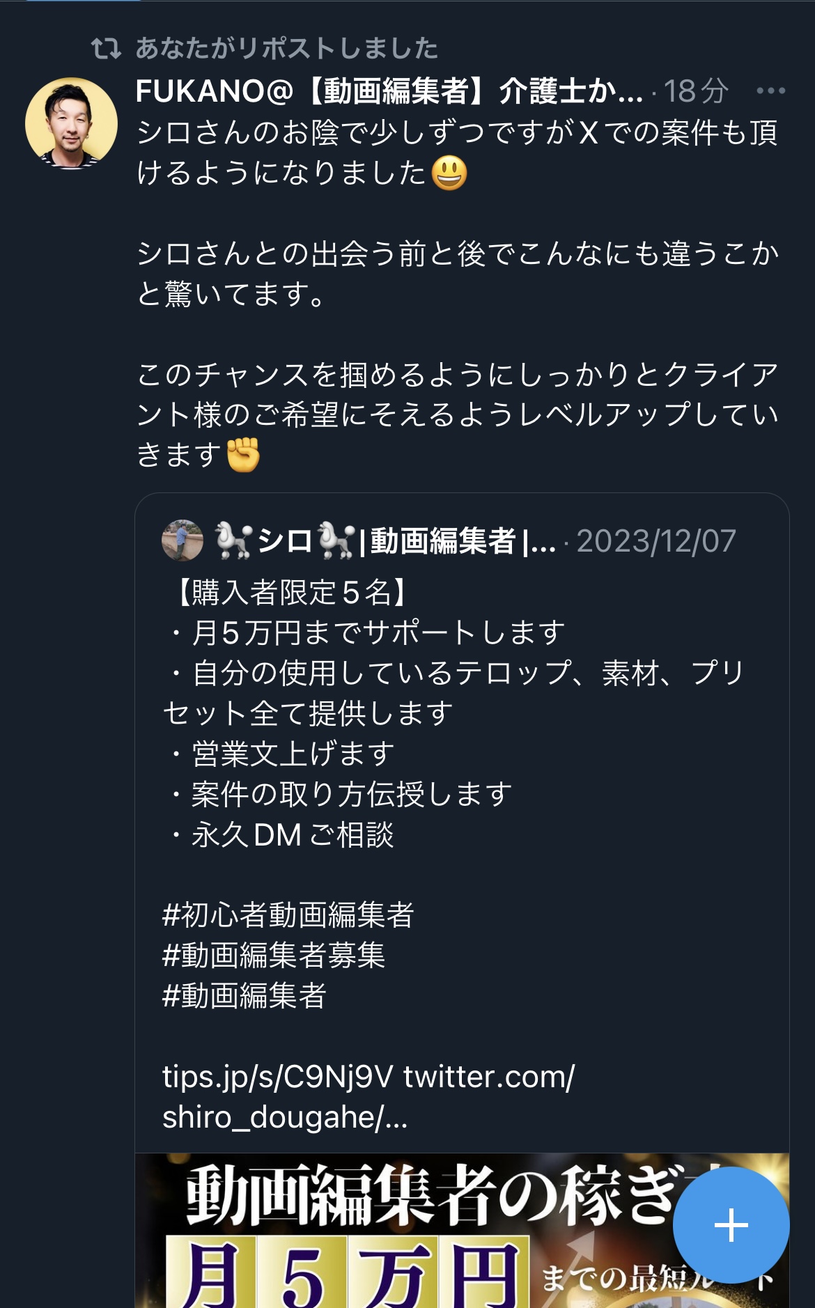 N.yさんは初心者の動画編集者で悩まれていましたので、Xでの営業秘訣を伝授しました。その結果☟☟