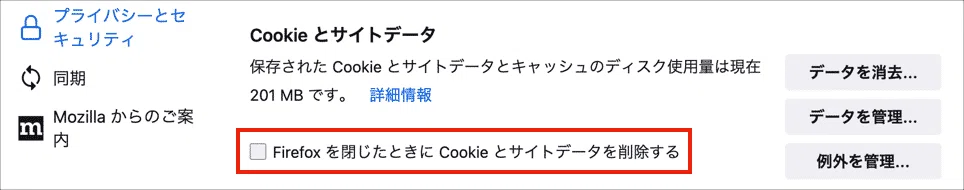 その中の「プライバシーとセキュリティ」の「Firefoxを閉じたときにCookieとサイトデータを削除する」のチェックを外します。
