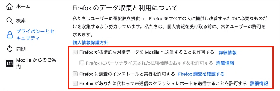 同じ理由で以下の「Firefox のデータ収集と利用について」の項目もチェックを外しましょう。