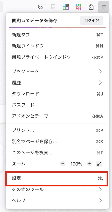 Firefoxがインストールできたら、ブラウザを開いて右上の「三」の部分をクリックして、「設定」(またはオプション)をクリックします。
