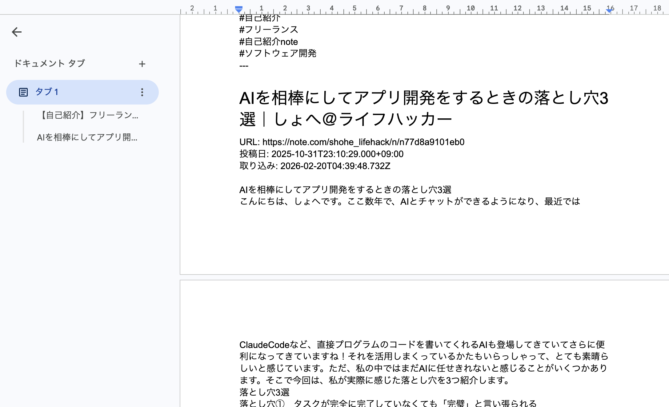 取り込みをするたびにGoogleドキュメントに追記されていき、集約されたノウハウとして活用することができます。