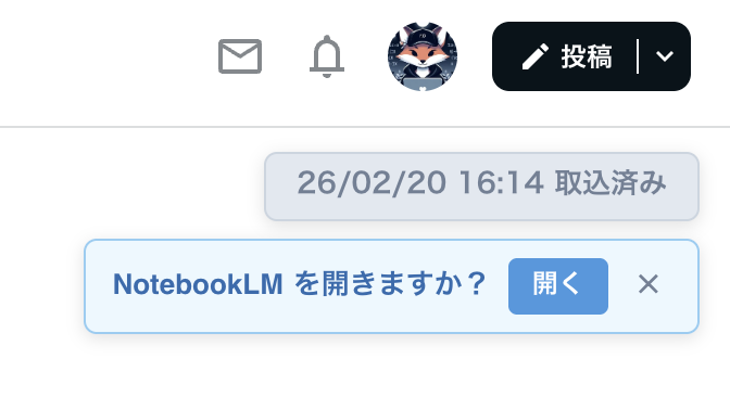 取り込み後すぐにNotebookLMを開くことができるサポート機能もついています。
