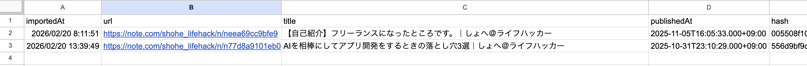 記事のタイトル、URL、記事の投稿日、取り込み日時、本文がGoogleドキュメントに書き込まれます。(画像は含まれません)