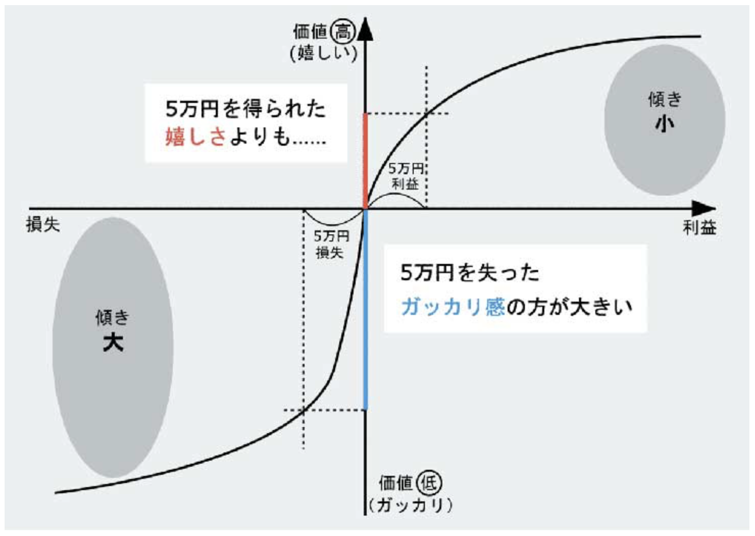よく企業が失敗した事業からなかなか撤退できず、さらに追加資金を投入してしまう例が見受けられます。サンクコスト(埋没費用:一度投下してしまった回収できない費用)に引きずられ、損切りの意思決定ができないわけです。これがプロスペクト理論でいう「意思決定バイアス」です。またギャンブルの例で恐縮ですが、負けが込むほど大金をかけて一発逆転を狙い、結果として再起不能に陥るのも、この理論で説明ができます。