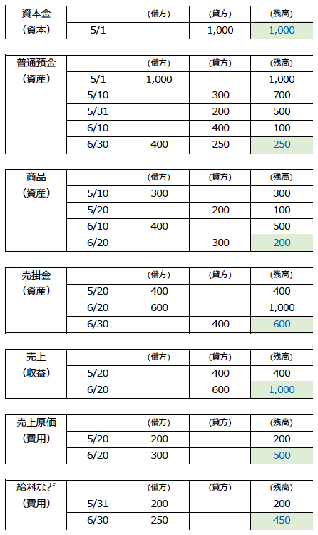 この2ヵ月間の取引を、勘定科目別に並べてみます。ちなみに、これを「総勘定元帳」といいます。(緑色地の数字が最終残高です)