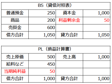 PLでは、売上高が1,000万円、売上原価が500万円、売上総利益(粗利益)が500万円、給料などの経費(販売費及び一般管理費と言います)が450万円、その結果、当期利益が50万円となりました。