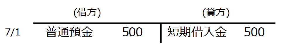これでは7月の商品仕入れもできませんし、給料も払えません。そこで銀行から500万円の借り入れをすることにしました。この時の仕訳は以下です。
