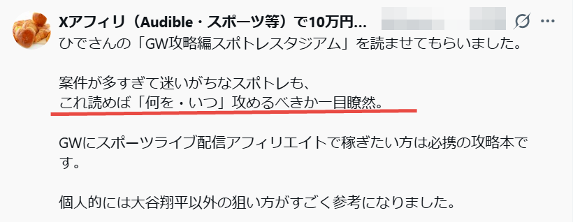 私は副業でスポーツのライブ配信を紹介して、アフィリエイト報酬を得る『スポトレアフィリエイト』を実践しています。ちなみに『スポトレ』とは、スポーツ×トレンドを合わせた造語で私が名付けました。