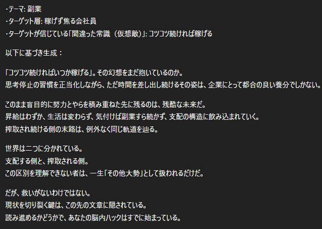 「読者の脳内をハックする文章」を出力させることに特化させたのだ。