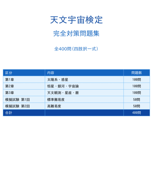 本問題集は、太陽系の基礎から最新の宇宙探査成果、さらには観測の実務知識までを網羅し、本番さながらの模擬試験(計100問)を収録した、全400問の完全対策教材です。