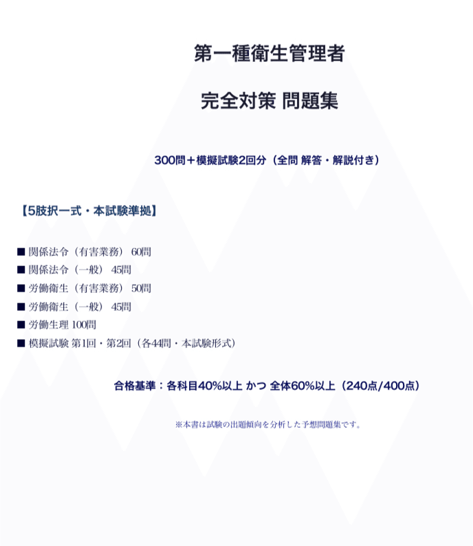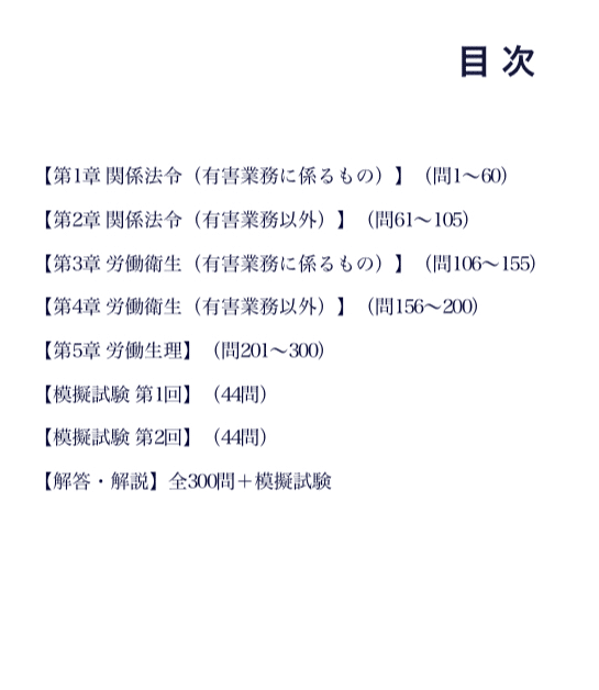 本問題集は、有害業務を含む全範囲を5つのセクションに分け、頻出の重要ポイントから本番形式の模擬試験(計88問)までを網羅した、一発合格のための完全対策教材です。