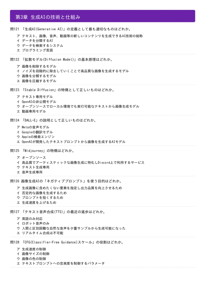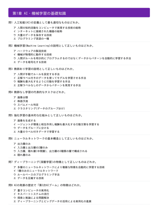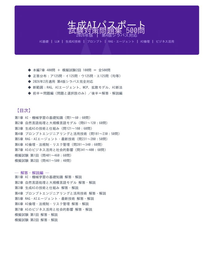 ・問題構成: 全800問(500問+300問)・第1章~第3章:AI基礎・LLM・生成AIの仕組み (180問)・第4章~第5章:活用技術・最新トレンド (100問)・第6章~第7章:倫理・法規制・ビジネス活用 (120問)・模擬試験: 第1回・第2回(各40問)