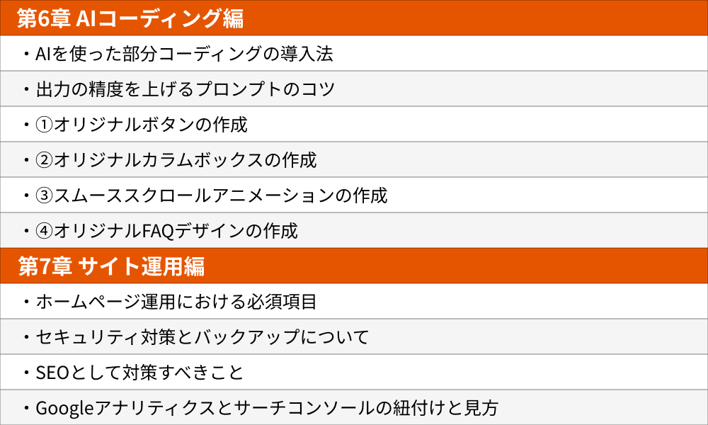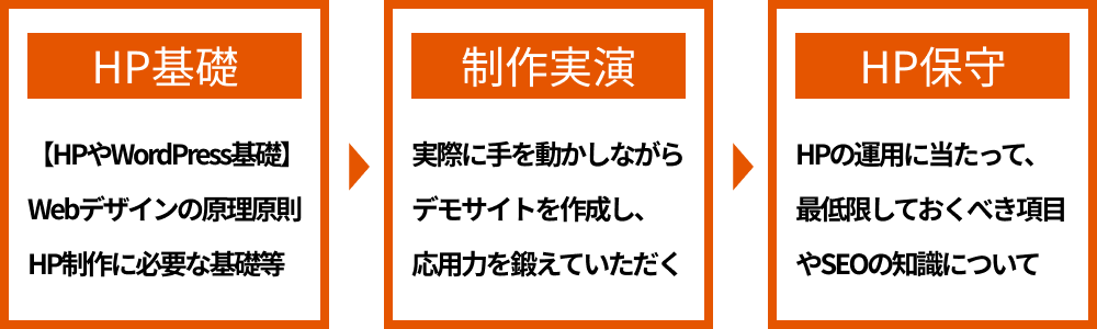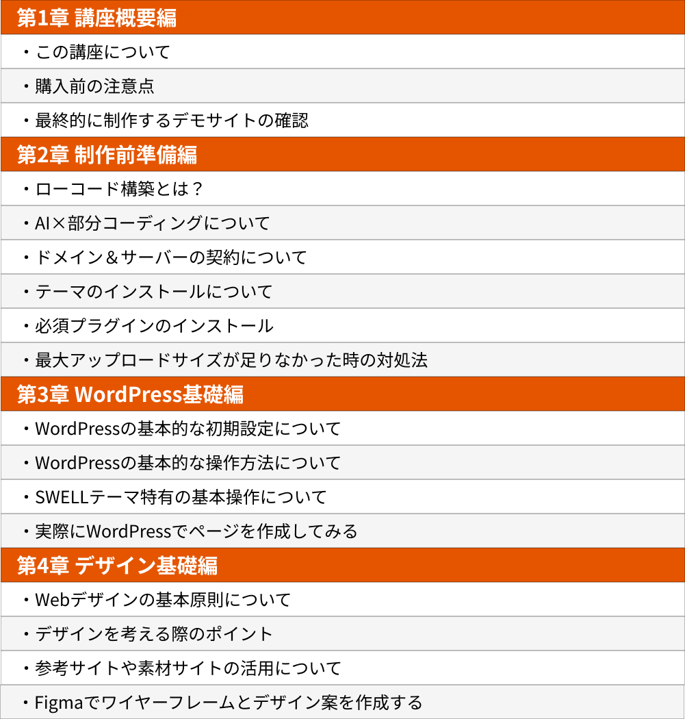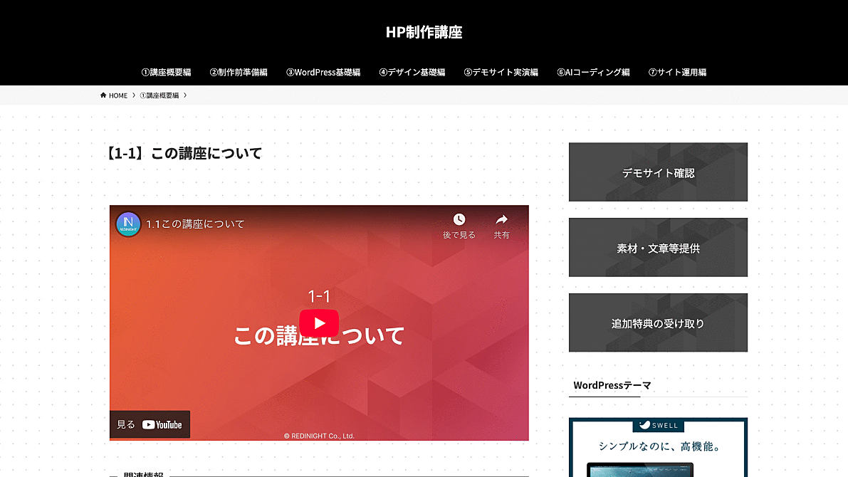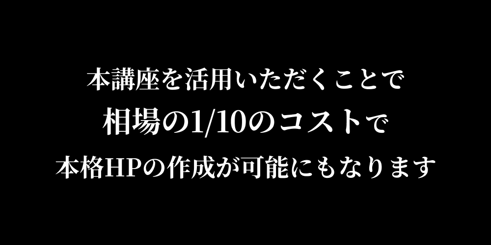 あとは応用的なカスタマイズとしてHTML、CSS、JS等を使用して別途ご対応いただく必要がございますが、通常のHPであれば問題なくこの講座だけで対応できます。