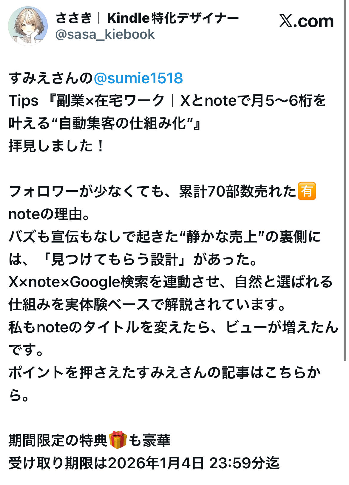 ※ 当時のタイトル →『副業×在宅ワーク|Xとnoteで月5〜6桁を叶える“自動集客の仕組み化”』