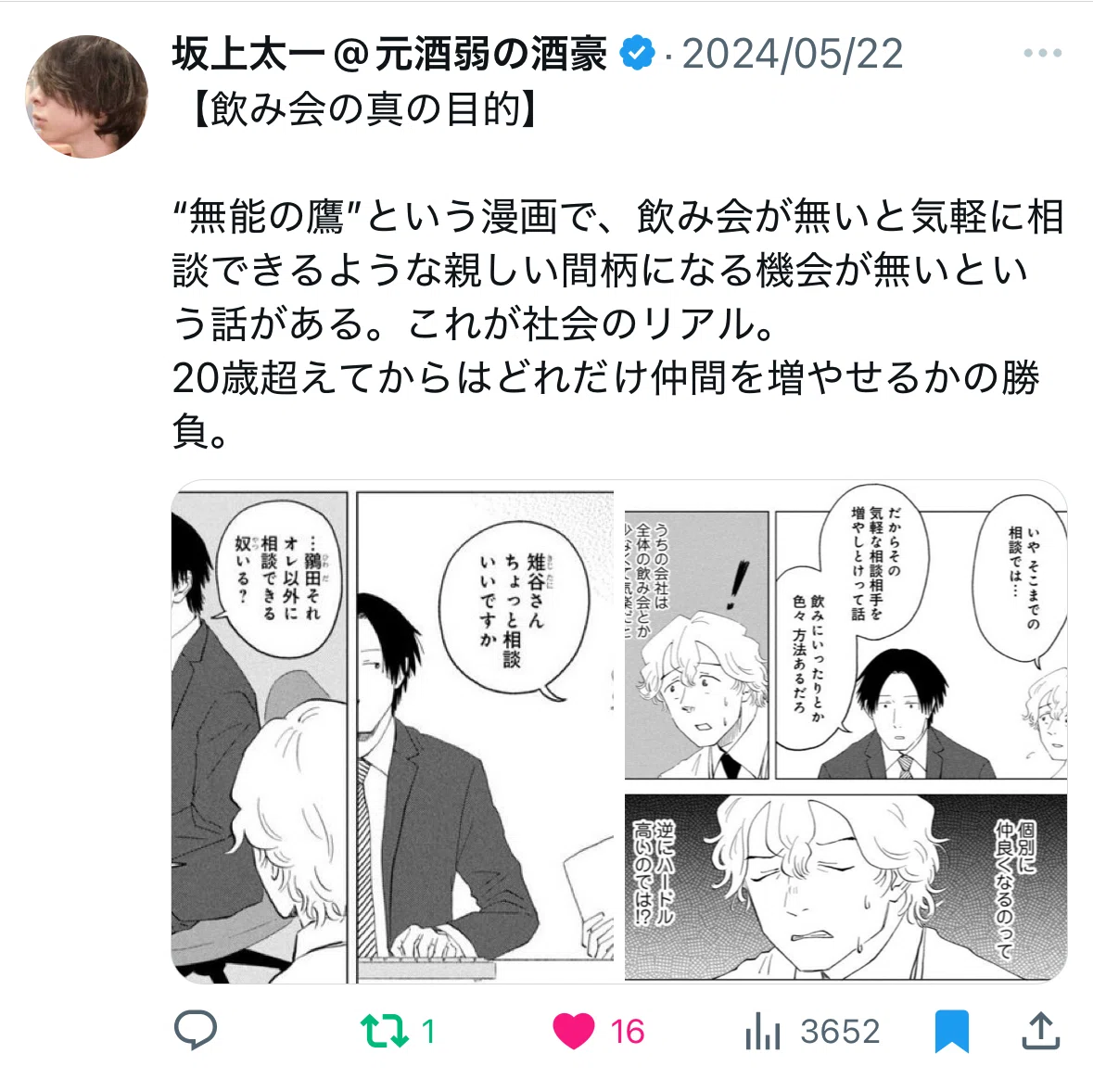 大人同士が仲良くなれるのが飲み会ということに気付く。