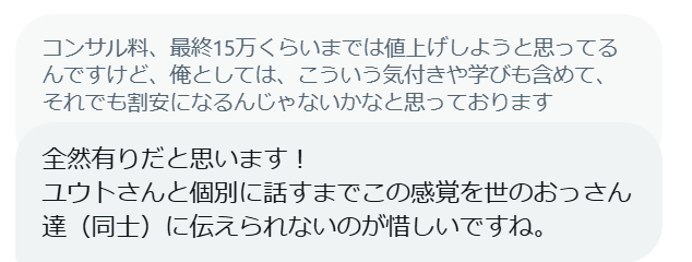 まあこういう感想を見ていただければ分かる通り、いつもXで発信している感じで、コンサルをやってます。