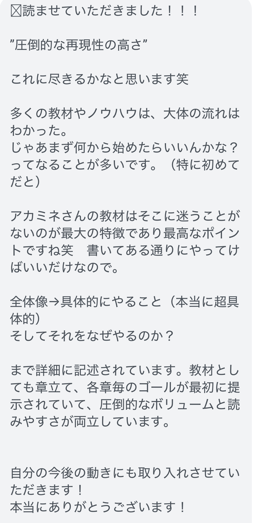 アカミネさんの教材はそこに迷うことがないのが最大の特徴であり最高なポイントですね笑 書いてある通りにやってけばいいだけなので。