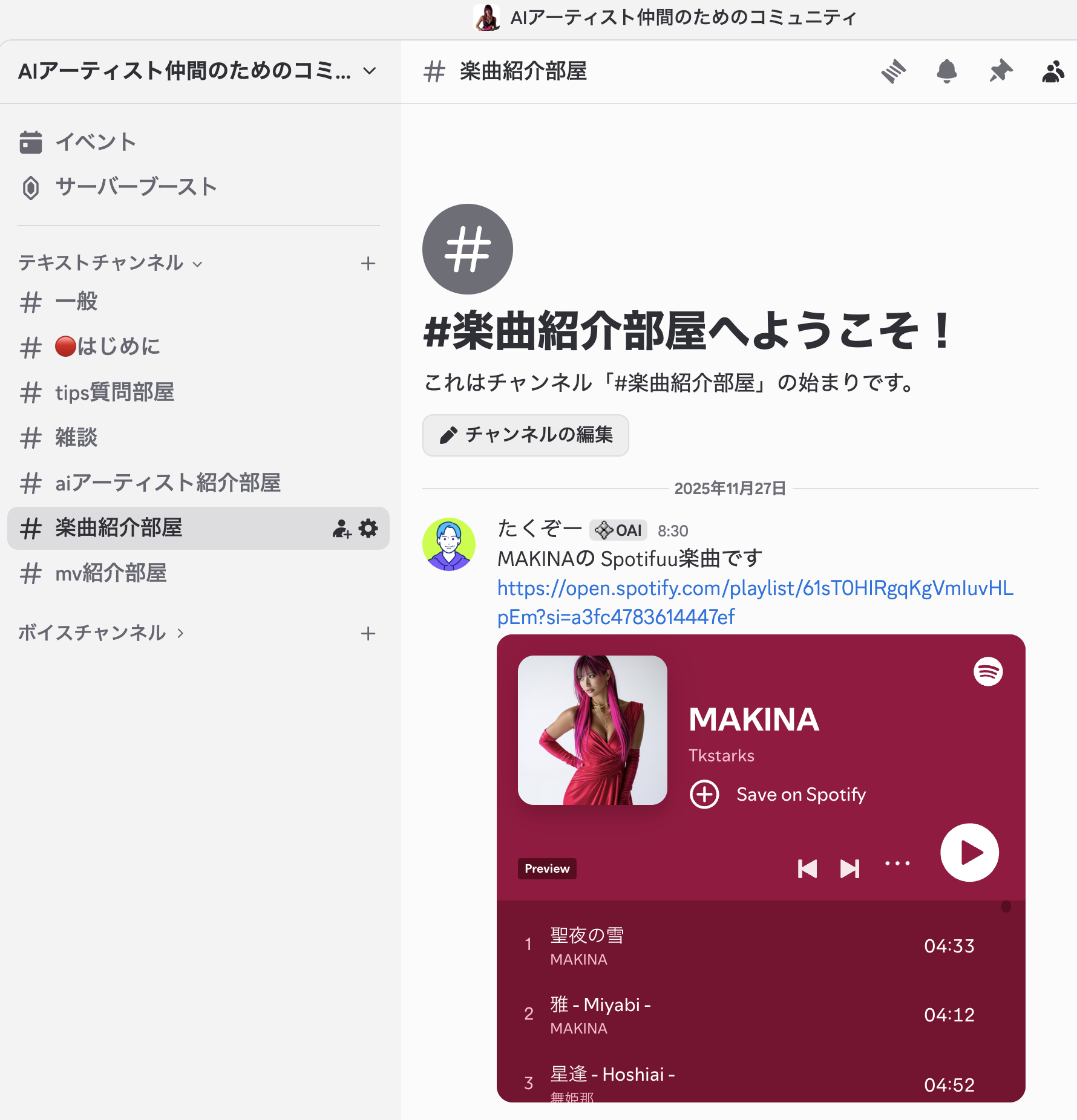 購入者限定、Tipsに関する質問やAIアーティスト・楽曲・MVの発表など行うコミュニティです。