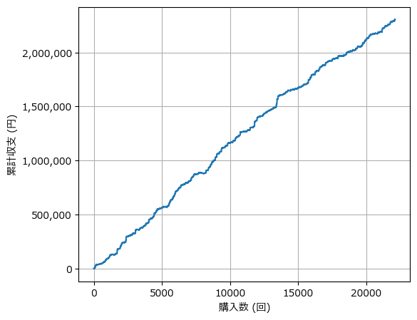 驚くほど綺麗な右肩上がり!回収率は200%を超えました。 「これこそが必勝法だ!」と叫びたくなりますよね。 でも、ここには大きな落とし穴があります。